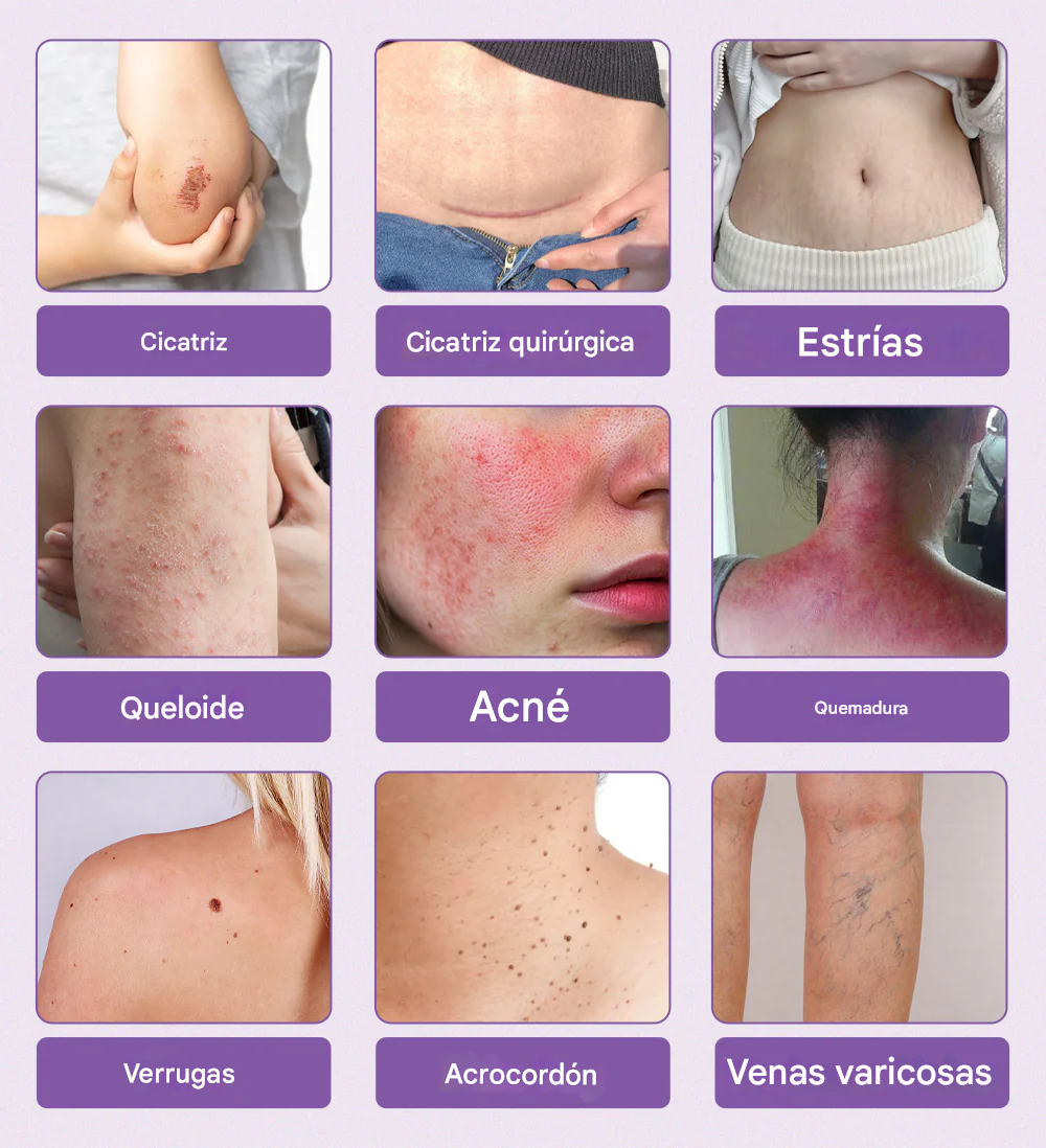 Resultados visibles en tiempo real: mejora la textura, difumina cicatrices antiguas y recientes, y atenúa marcas como estrías, queloides y daño post-acné.